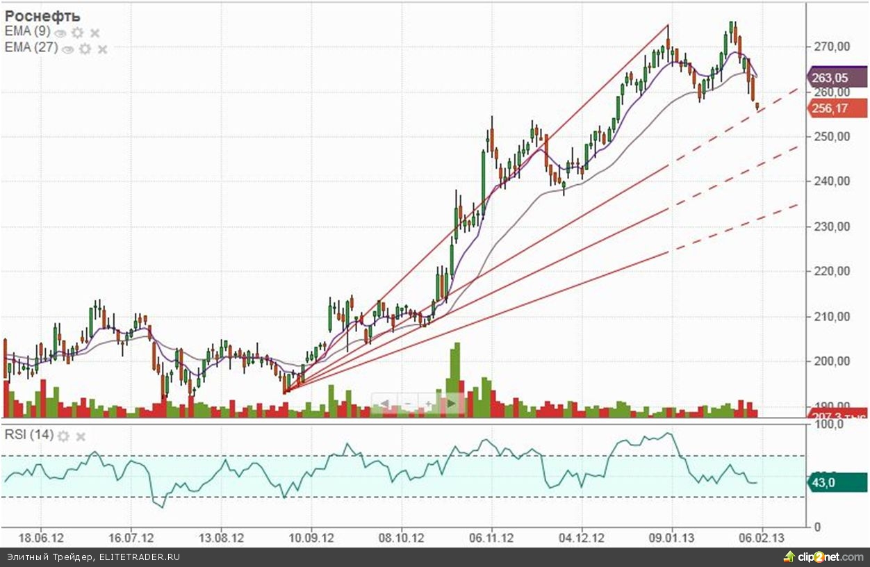 Плохая отчетность Роснефти была учтена движением цены. В краткосрочной перспективе наиболее вероятен сценарий движения по фигуре «двойная вершина», при которой минимальное падение составит до уровня 240 руб. за акцию.