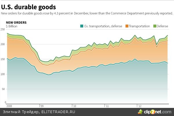 Обнародованная вчера статистика, также оказалась негативной, в части пересмотренных данных по заказам на товары длительного пользования за декабрь, рост которых составил 4,3% против первой оценки в 4,6% и 1% без учета транспорта, против первой оценки в 1,3%. Рост фабричных заказов в декабре не дотянул до прогнозных 2,2%, составив 1,8%.