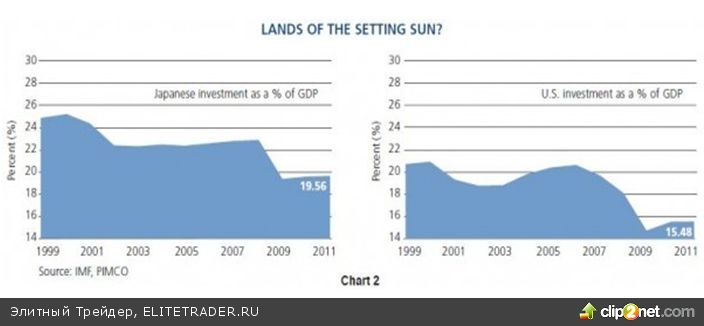 Самый яркий исторический пример негативного влияния политики нулевых процентных ставок – Япония. В условиях процентных ставок, прижатых к нулю в течение последней декады и более, резко сокращающийся уровень инвестиций в основной капитал, как показано на chart 2, является наиболее очевидным развитием событий. Японский кредитный рынок пережил состояние Сверхновой звезды, взорвался и затем сжался сам в себе. Деньги и кредит могут потерять свою силу и их “звездное” время может закончиться для развитых экономик, включая США.