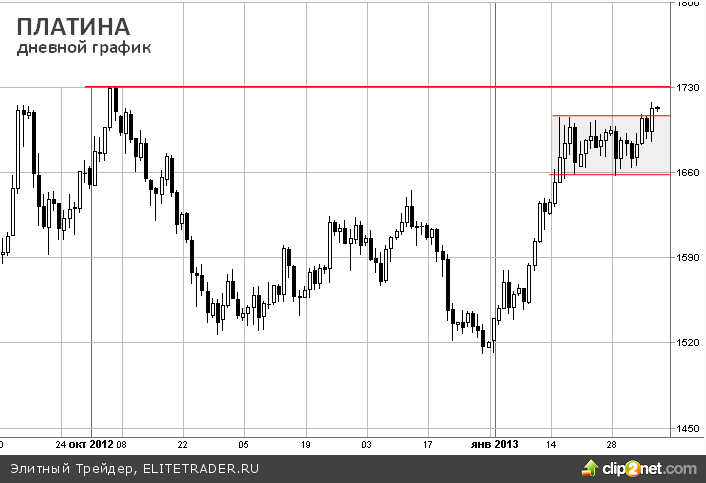 На графике можно заметить, что цена платины покинула тянувшийся 3 недели боковой канал, ближайшим сопротивлениями теперь является 4-х месячный максимум $1734.5/тр.унц. и максимум прошлого февраля на $1739/тр.унц.