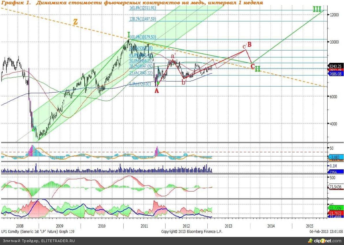 После роста стоимости фьючерсных контрактов на медь, который наблюдался в течение 2009–2010 годов, цены на металл вступили в фазу компенсации, которая, на наш взгляд, будет исполнена в форме плоской коррекции. В настоящее время формируется восходящая волна B, целью которой видим отметку $9365 за 25 метрических тонн. Волна С в плоской коррекции обычно приблизительно равна 1/3 волны A, отсюда ориентиром снижения в рамках данной волны может служить уровень $8450–8455, после чего стартует фаза роста, целью которой является отметка $12312 за 25 тонн.