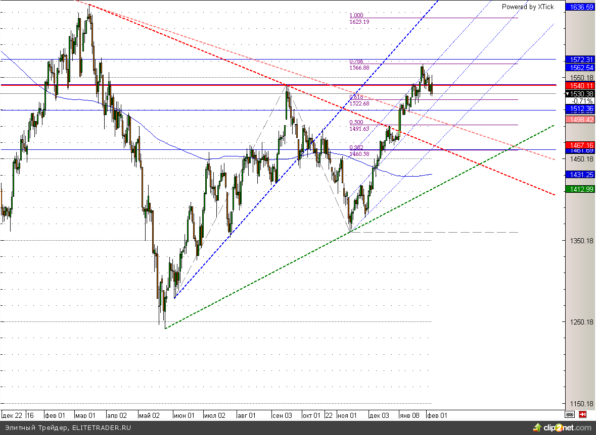 Техническая картина по ММВБ уже совсем не бычья. Уровень 1540 снова превратился в сопротивление, и теперь уже медведи будут диктовать свои условия. Как и ожидалось, в отсутствии положительных фундаментальных факторов рынки не могут расти до небес. Поэтому коррекция от данных уровней, скорее всего, продолжится и первой целью станет отметка 1510.