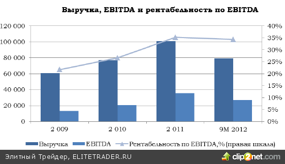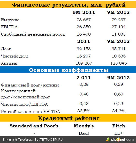 по итогам 9 месяцев 2012 года выручка компании составила 79,2 млрд. рублей, показатель EBITDA достиг 27,2 млрд. рублей, а чистая прибыль - 19,1 млрд. рублей;