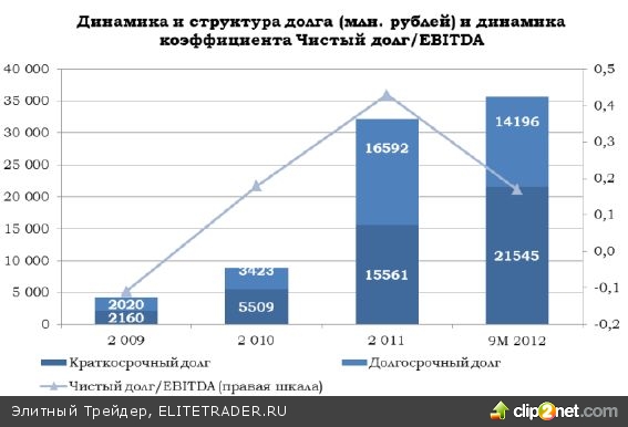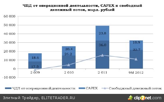 Несмотря на рост чистой прибыли, чистый денежный поток от операционной деятельности по итогам 9М 2012 года сократился на 21,5%, составив 21,7 млрд. рублей. Основной причиной стали изменения в оборотном капитале. Объем CAPEX за год также сократился на 5,2% и составил 10,7 млрд. рублей (около 40,0% EBITDA). По этой причине, денежный поток компании остается положительным, по итогам 9 месяцев прошлого года он составил 11,0 млрд. рублей.