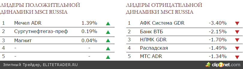 Хуже рынка также закрылись бумаги «Газпрома» (GAZP RM, -1.03%), «Сургутнефтегаз»-ао (SNGS RM, -1.17%), «Уралкалий» (URKA RM, -1.03%), «ФСК ЕЭС» (FEES RM, -1.18%), «Холдинг МРСК»-ао (MRKH RM, -1.84%).