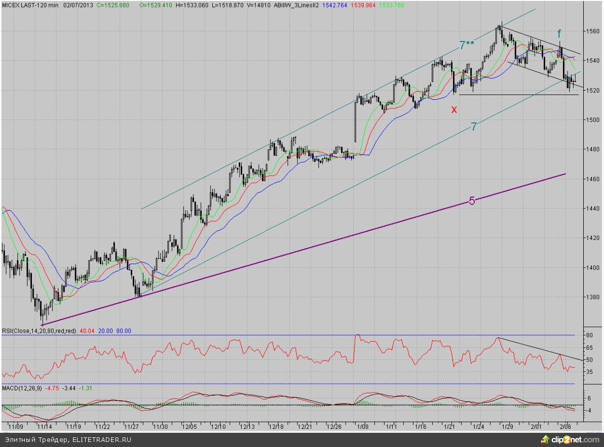 Исследуя 2-часовой график индекса ММВБ, видим, что открывшись почти на тех же уровнях, котировки попытались расти – ведь цены находились в районе неплохой поддержки в лице нижней границы среднесрочного растущего канала (7-7*), и «быки» логично попытались организовать отскок. Однако сил у них явно не хватало, и «медведи», видя это, возобновили атаку и уверенно преодолели и тренд (7) и проходящую чуть ниже нижнюю грань флага. Но такое развитие событий было в принципе ожидаемым, о чём мы писали в предыдущие дни. А вот более серьёзный редут «бычьей» обороны в лице дневного фрактала на продажу Х (1517 п.) охладил пыл «бурых», и цены сумели даже подтянуться обратно к тренду (7). Правда, вернуться на него впоследствии так и не удалось, и день закрылся чуть ниже этого уровня.