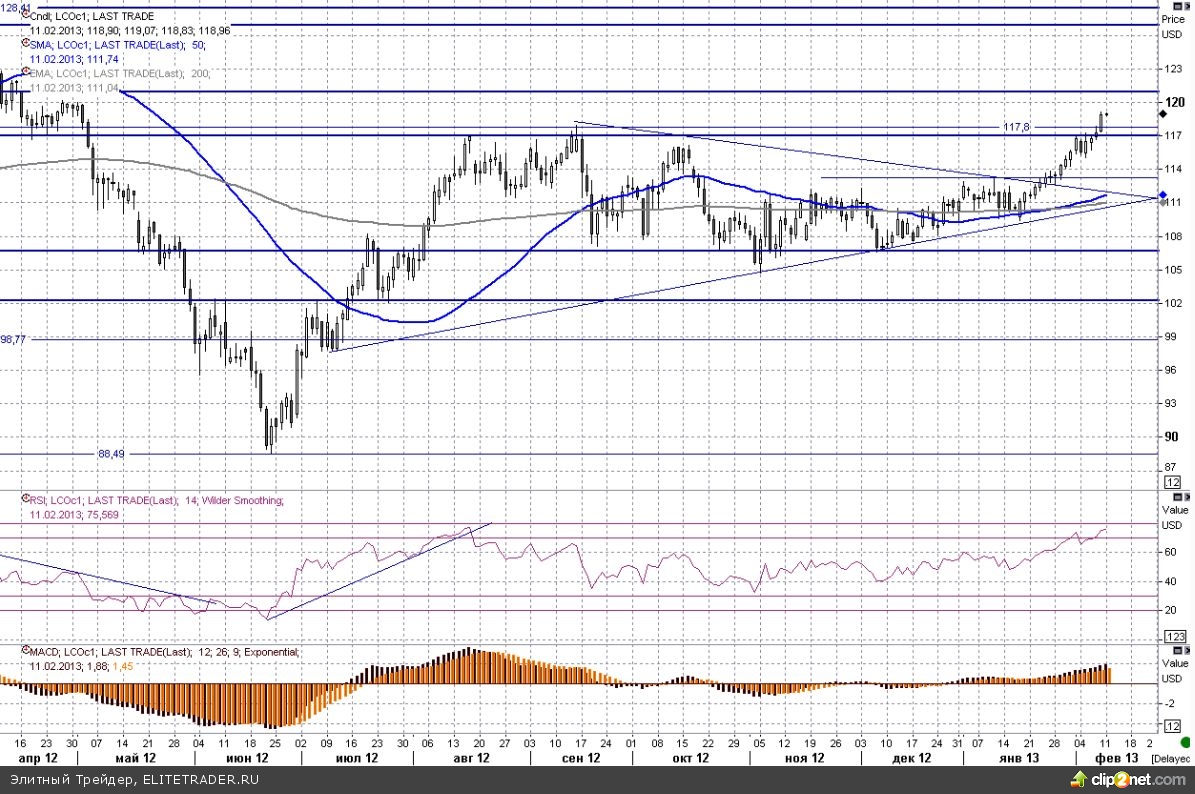 Что касается конкретных уровней по сорту Brent, то в прошлую пятницу мы наблюдали за продолжением фазы роста. На фоне оптимизма из Китая (статистика по торговому балансу, а также рост импорта нефти на 7,4% г/г) и иранских перипетий, котировки успели пройти расчетный уровень $117,8. После чего открылась дорога к следующей отметке сопротивления на $120,5 за баррель. Пройти существенно выше этих рубежей без формирования полноценной коррекционной волны вряд ли получится.