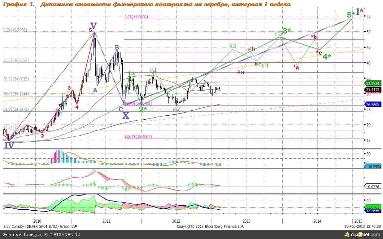 В течение III квартала 2012 года стоимость унции серебра повысилась от отметки $26,16 до значения $35,3563 (+35,15%), данное движение котировок вверх мы расцениваем как первый импульс в рамках растянутой волны #3 в волне I*, окончательной целью которой (волны I*) видим уровень $54 за унцию (71,91%). После чего последовало зигзагообразное умеренное снижение, которое мы расцениваем как коррекцию перед продолжением роста.