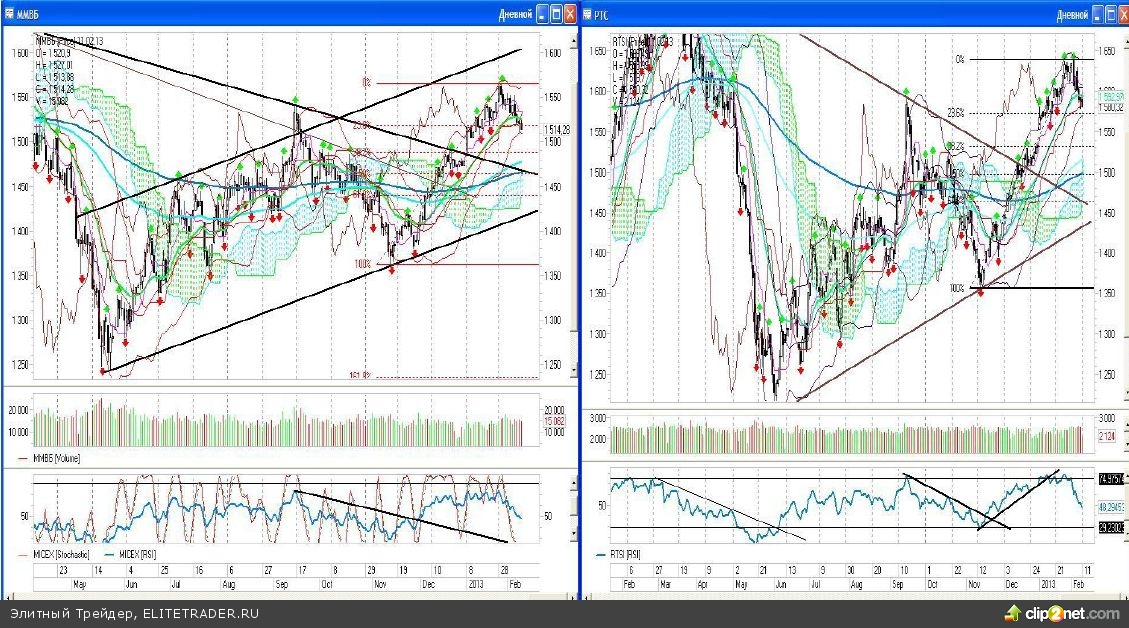 Индекс ММВБ закончил день на уровне 1515,22 пунктов, что ниже ближайшего дневного фрактала на продажу, расположенного на отметке 1517,01 пунктов. Фракталом на продажу стал минимум 22 января, чуть ниже него на уровне 1507,34 пунктов также находится еще один дневной фрактал на продажу, соответствующий минимуму от 16 января. В случае последующего пробоя и удержания и этого рубежа, «медведи» уже на этой неделе могут реализовать цель в виде 1490 пунктов.