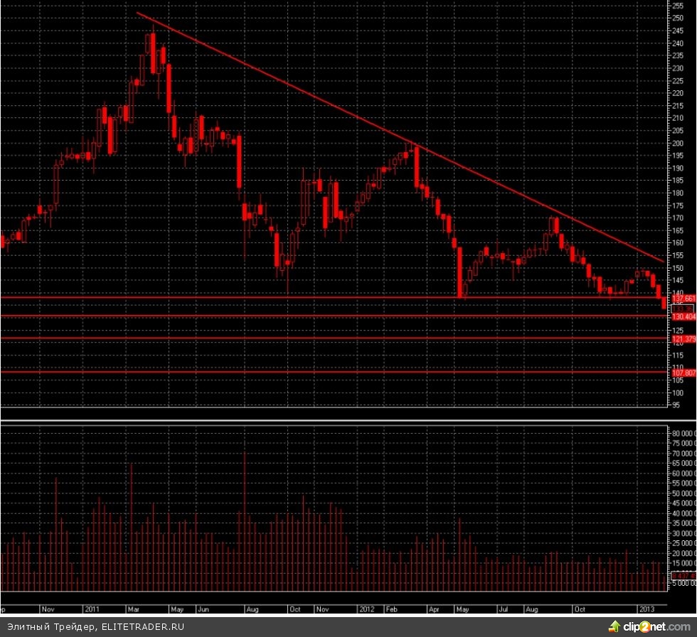С 2011 года акция «Газпрома» показывала краткосрочные отскоки, однако разворот тренда так и не сформировался. Аналогичная динамика наблюдается в большинстве акций металлургов и энергетиков.