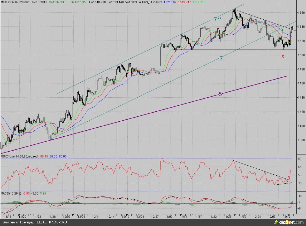 С технической точки зрения плюсом для покупателей является то, бычьи дивергенции, про которые мы писали вчера, сработали, и акция «по 2-м часам» по Б.Уильямсу вошла в покупку, а «по дням» вышла из продажи. А с преодолением и падающего краткосрочного тренда перед ними открылась хорошая перспектива возобновить среднесрочный рост. В этом случае ближайшим сопротивлением выступит растущий тренд (7), а далее предыдущий локальный максимум (1 553,19 п.) и годовой экстремум (1 566,42 п.) Однако и про оборону быкам забывать нельзя. Им желательно удержать краткосрочный падающий тренд, который наряду со вчерашним послеобеденным минимумом (~1 531 п.) сыграет роль ближайшей поддержки. Более сильным редутом выступит район преодоленного вчера 2- часового фрактала f (1527 п.)