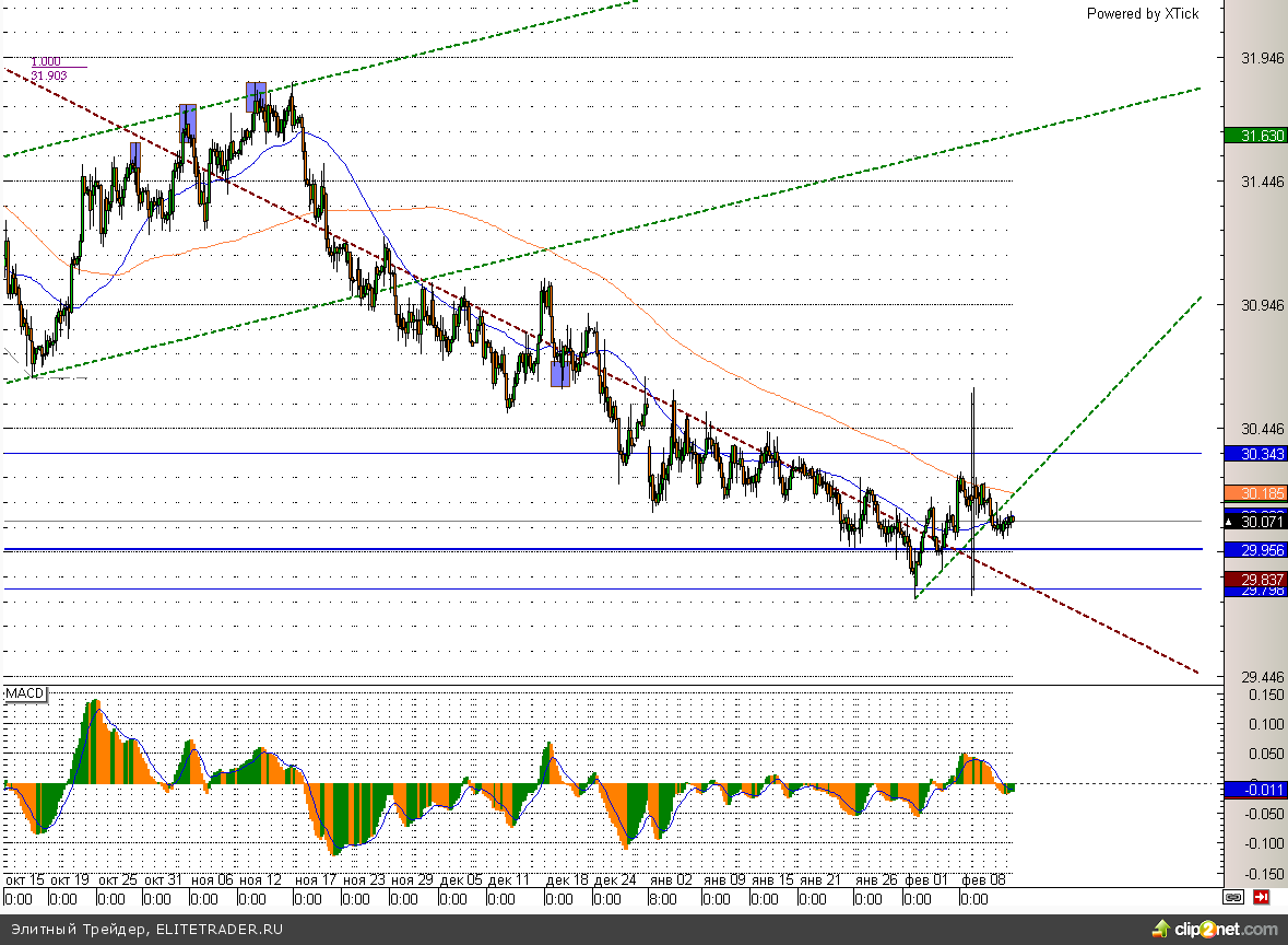 Рубль снижается к доллару на 5 копеек. Доллар/рубль продолжает торговаться в боковом диапазоне вблизи отметки 30, и пока существенный выход в любую из сторон без дополнительных драйверов достаточно затруднителен. Впрочем, в случае появления таковых, отметка 30,2 может быть преодолена очень быстро с дальнейшей целью 30,35. Тем временем после Euroclear на российский рынок придет еще один ведущий международный депозитарий. Clearstream откроет счета в российском Центральном депозитарии уже в первой половине февраля, что будет способствовать дополнительному притоку иностранного капитала и соответственно спросу на российскую валюту. При этом есть и негативные для рубля новости. Таким образом, в Минфин поступило предложение от Банка России, чтобы Министерство финансов покупало валюту для национальных фондов (Резервного и Фонда национального благосостояния) на открытом рынке, заранее объявляя объемы. Данное предложение пока находится в стадии обсуждения, но если это все-таки произойдет, то в случае значительных объемов покупки валюты курс рубля может значительно пострадать.