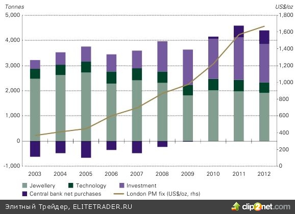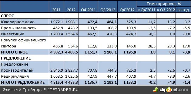 Прирост на 1% в 4-м квартале 2012 года обусловлен более высокой средней ценой, обновившей в октябре-декабре новый исторический максимум. Нынче он равен $1721,8 за унцию.