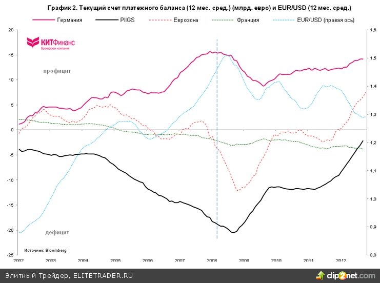 Более того, страны периферии начали резко наращивать свой экспортный потенциал. Дефициты по счету текущих операций периферийных стран в значительной степени сократились, при этом Германия продолжила расширять профицит торгового баланса. Казалось бы, это стоит расценивать как исключительно позитивный момент. Но Германия стала слишком зависима от экспорта. В случае резкого замедления спроса на немецкие товары на международных рынках крупнейшая экономика Еврозоны окажется в очень неприятном положении. Это может нарушить начавшийся процесс посткризисной балансировки европейской системы. Неважно выглядят дела у Франции. На графике 2 видно, что дефицит по счету текущих операций второй экономики Еврозоны продолжает расширяться, при этом 2/3 внешней торговли страны сосредоточено в зоне евро. Франция продолжает терять конкурентоспособность.