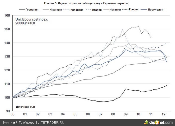 Тем не менее, структурные дисбалансы Еврозоны (особенно в периферии) постепенно сокращаются, во многом благодаря процессу внутренней девальвации (сокращение заработных плат) (см. график 5).