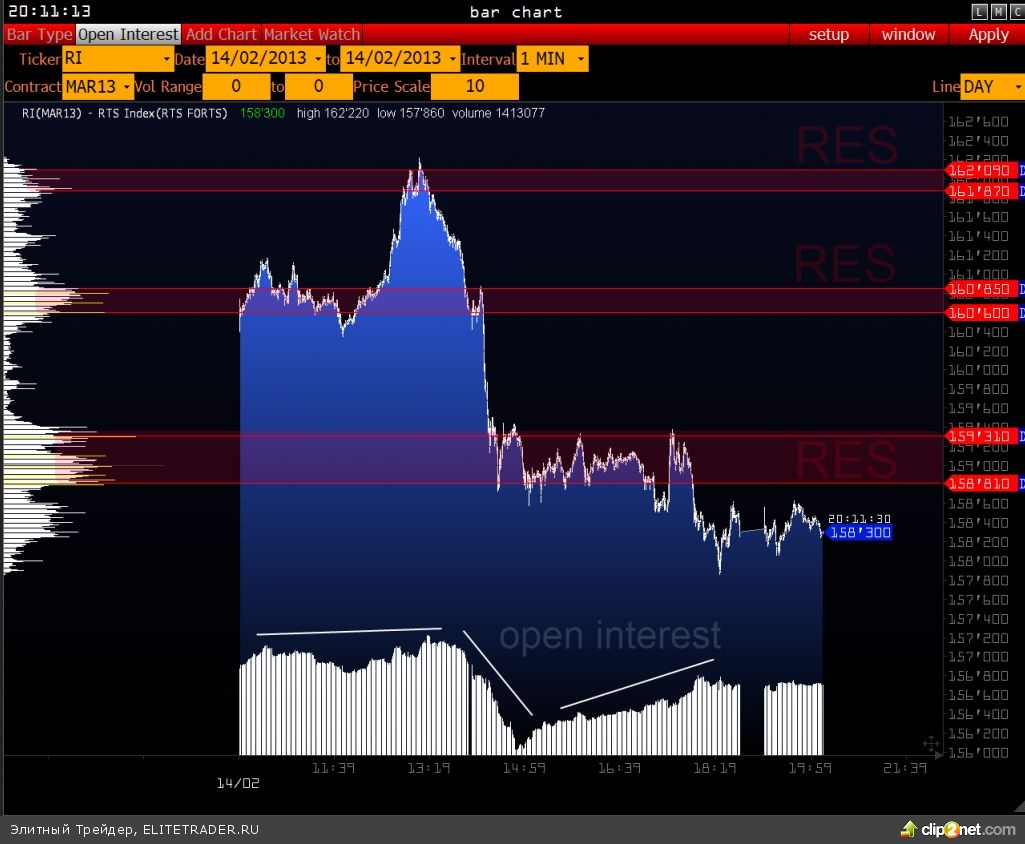 Очень интересен последний уровень, так как он не смог создать особого спроса и показатель открытого интереса на этом участке рос при снижении котировки, что так же является медвежьим признаком. Обратим внимание еще на одни факт. Обратите внимание на поисковик тиковых объемов. Прошли очень крупные трейды, как видите все они были заключены одной сделкой и как раз в диапазон 158300 по 159500.