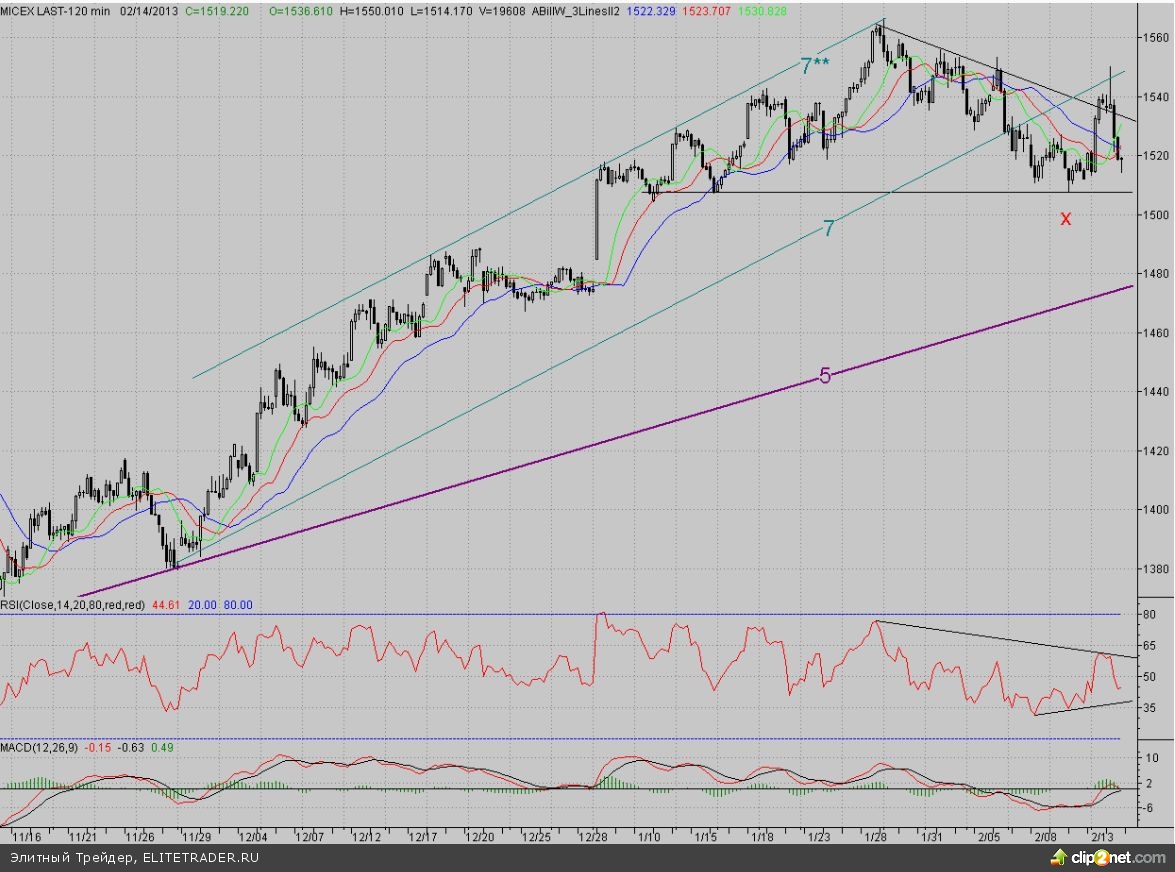 Исследуя 2-часовой график индекса ММВБ, видим, что открывшись с небольшим гэпом вниз, котировки ниже не пошли, поскольку сразу оказались на ближайшей поддержке в лице краткосрочного падающего тренда, который был преодолен «быками» днём ранее. От этого рубежа возобновились покупки, и цены, покорив максимум среды, направились выше и даже прокололи среднесрочный растущий тренд (7). И казалось, что «быкам» открывается путь наверх. Однако на максимуме от 6 февраля (1553,2 п.) их ждал ушатец холодной воды – от этого района «мишки», доселе расступавшиеся перед ними, сомкнули свои ряды и погнали «быков» обратно на Юг. Благо, и вышедшие в этот момент негативные данные из Европы были на стороне продавцов. В результате покупатели потеряли всё, завоёванное за предыдущие полтора дня, и цены лишь немного не дошли до сильной поддержки в лице минимумов середины января и фрактала на продажу Х (1507,5 п.), который вчера из 2-часового превратился в дневной.