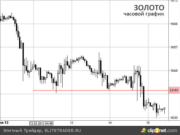 Цена золота продолжила снижаться на торгах в четверг (14 февраля) на фоне появления в ряде СМИ информации о том, что известные мировые инвесторы сокращают объемы вложения в металл по результатам 4-го квартала. Локальное сопротивление $1640 удерживало медведей несколько дней, теперь цены спустилились к уровню $1630, пробитие которого грозит походом к нижней границы нисходящего канала.