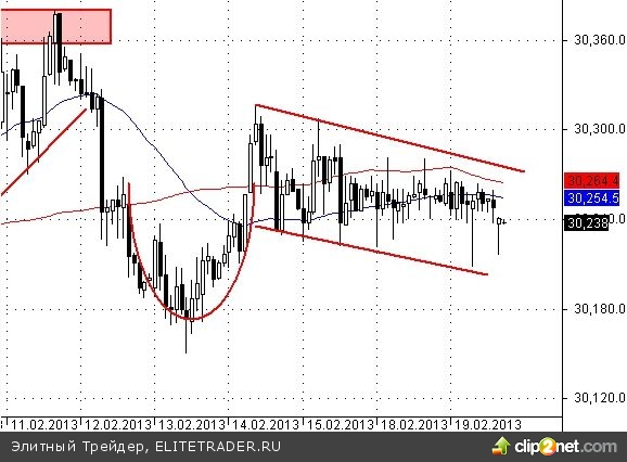 Во фьючерсе доллар-рубль четвертый день подряд продолжается «стояние» в диапазоне, который напоминает форму «флага». Вход в диапазон был осуществлен снизу вверх, что позволяет надеяться на выход из диапазона вверх (рисунок 2).