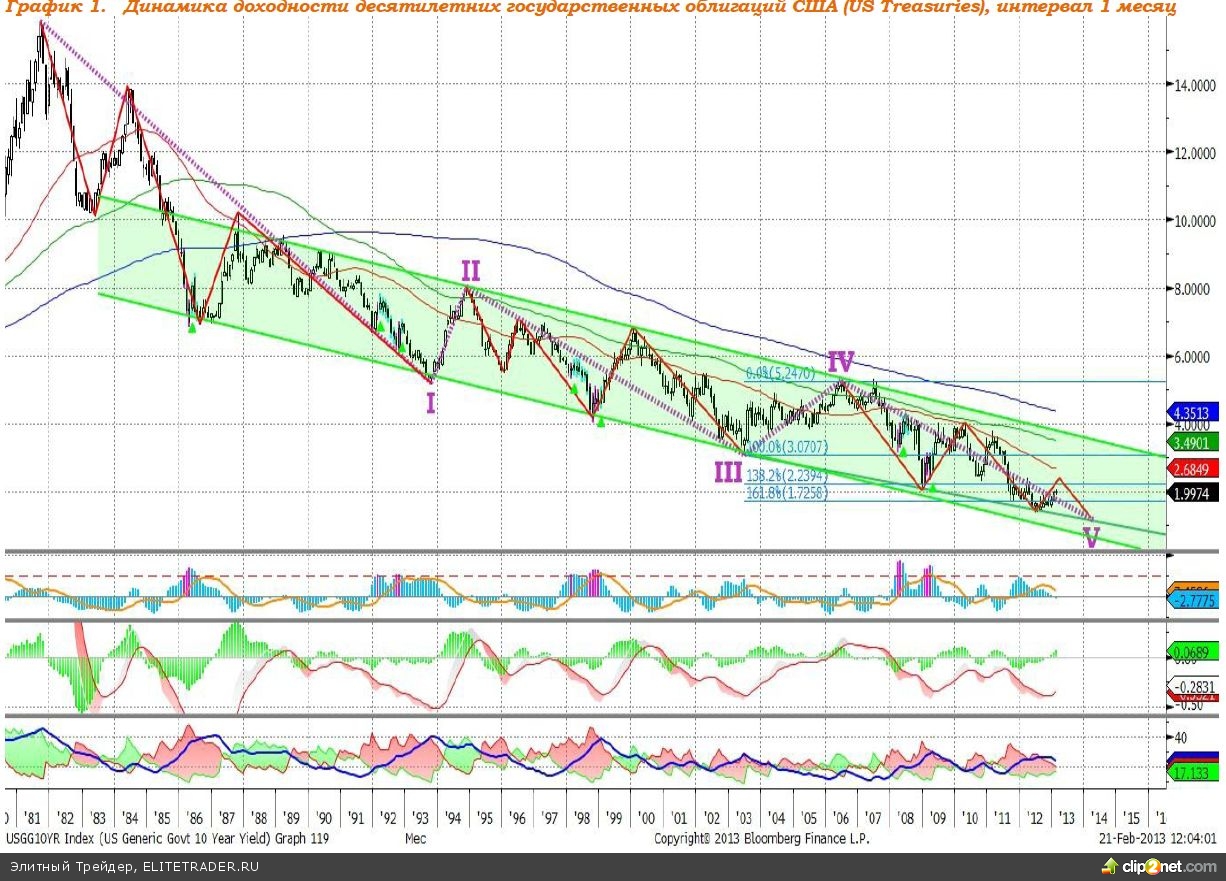 В настоящее время заканчивает формироваться 4-я коррек- ционная волна в масштабной волне V. Окончание волны V приходится на I квартал 2014 года, когда и будет достигнут минимальный уровень доходности (1,3-1,4%). Причиной снижения доходности, по нашим предположениям, может стать избыточная ликвидность на долговом рынке, которая может быть вызвана различными причинами — как ускорением темпов роста мировой экономики, так и бегством в качество, или очередным этапом операции «Твист».