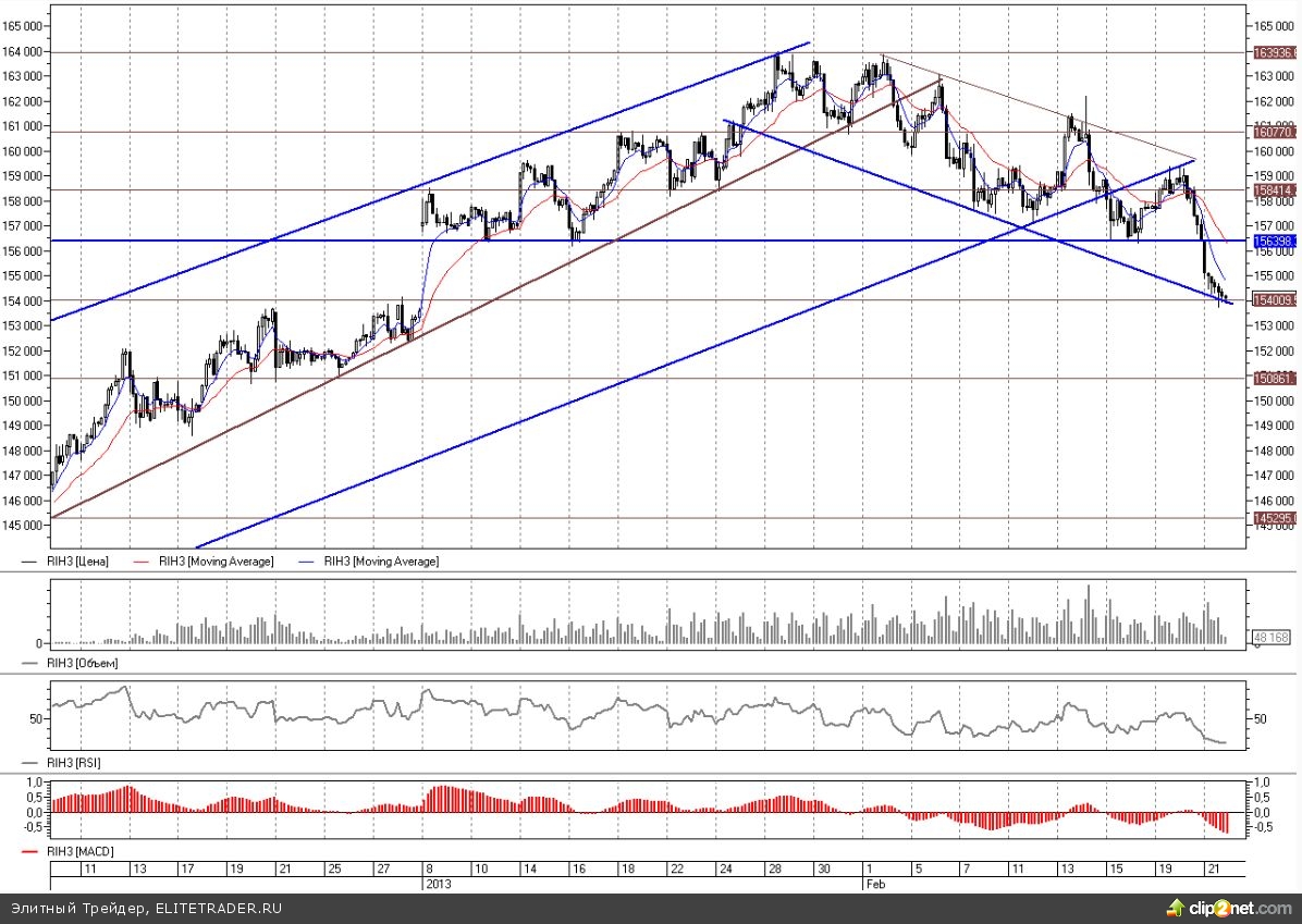 После возврата к пробитому ранее трехмесячному восходящему тренду с середины ноября в район 159000-159500 фьючерс на индекс РТС с чувством выполненного технического долга спокойно покатился вниз, пробивая по очереди все встречающиеся на пути поддержки. На этот раз был пройден долгое время сдерживавший уровень на 156400.