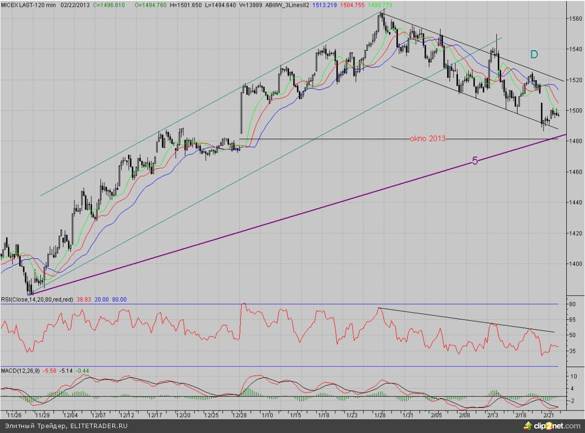 Таким образом, «быкам» не удалось как следует бодануться, и закрыть неделю обнадёживающе. Напомним, что для этого им надо было подрасти хотя бы на 0,7%. А пока отскок получился хиленьким. А это значит, что «бурые», чувствуя «бычью» слабину, постараются довести начатое почти месяц назад наступление до логического завершения и закрыть новогоднее окно. При этом среднесрочный растущий тренд (5) теперь уже проходит чуть выше него, здесь же расположена и нижняя граница уже среднесрочного падающего канала. Ближайшим редутом «бычьей» обороны выступит пятничное окошко (1494 п.).