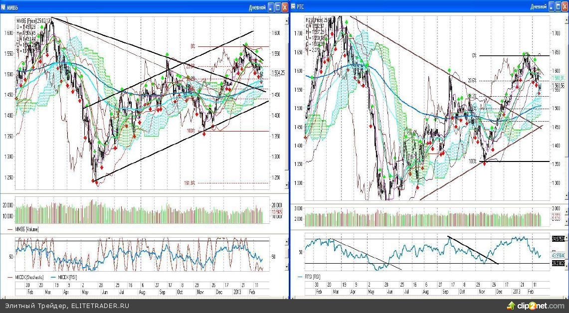 Кстати в качестве новых целей снижения я уже называла следующие отметки: 1477,87 и 1463,25 пунктов, которые соответствуют цене закрытия индекса ММВБ в последний торговый день 2012 года, то есть нижней границе постновогоднего разрыва и 50% уровень коррекции Фибоначчи от роста с 1360,07 до 1566,42 пунктов.