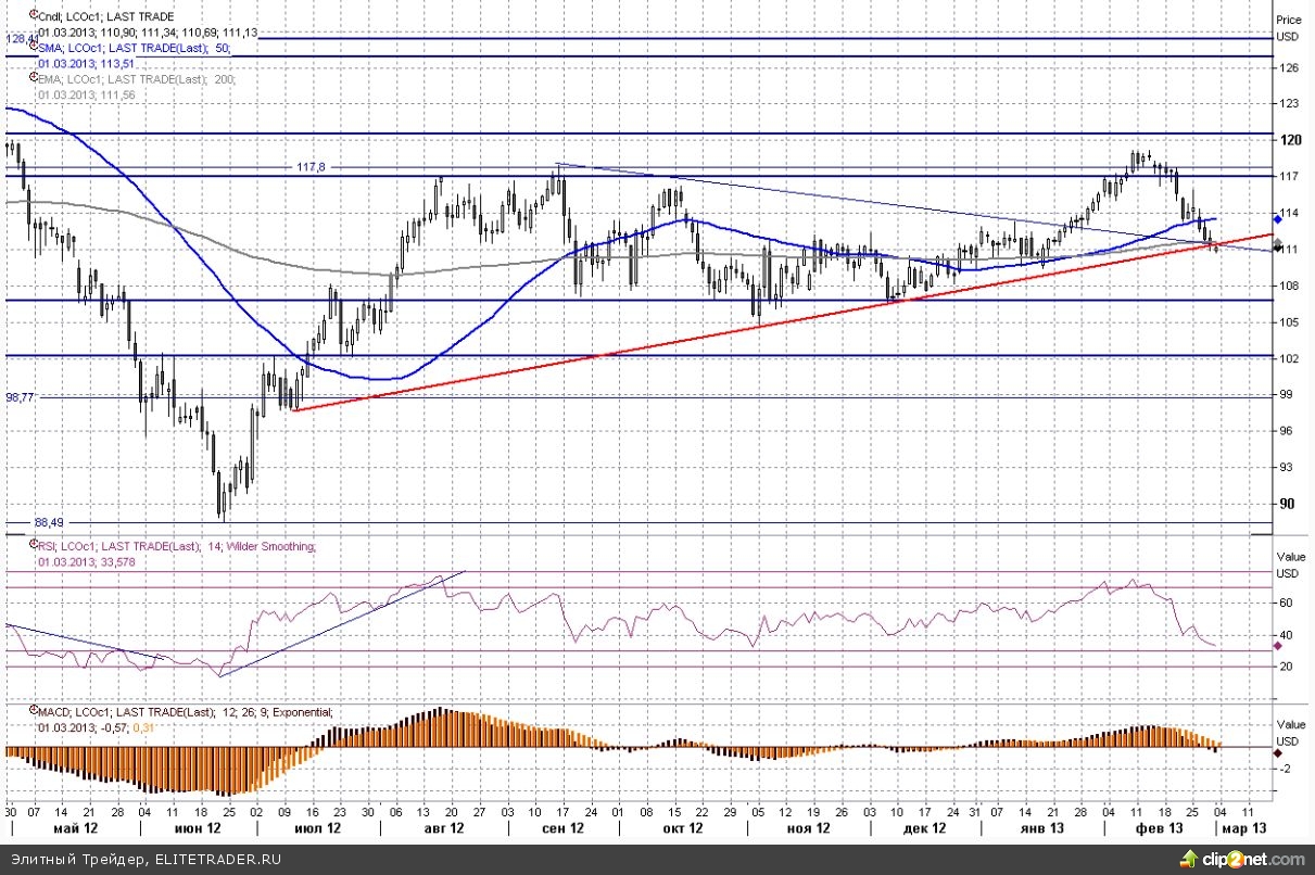 Уходящая неделя стала плавным продолжением предыдущей. Общая негативная динамика продолжилась, и распродажи заставили котировки черного золота откатиться к своим ключевым уровням поддержки. В частности котировки вплотную подобрались к отметке $111 за баррель, где лежит нижняя граница восходящего канала последних месяцев. Со своих недавних максимумов цена успела снизиться уже на $8 и спускаться дальше с точки зрения «техники» не рекомендуется, так как среднесрочная бычья формация в этом случае будет полностью нарушена.
