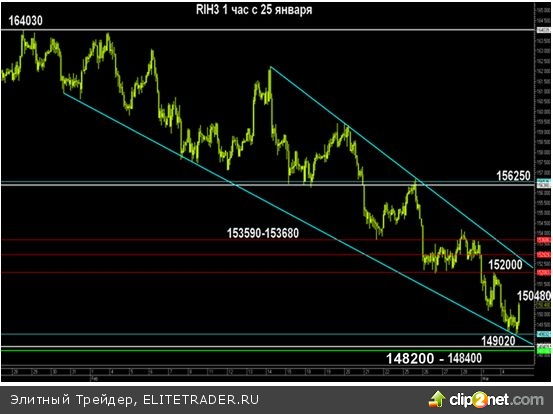 Фьючерс на Индекс РТС - RIH3 на “вечёрке” вырос на 0,66%. Утром вчера я писал, что он близок к цели по ГиП, которая здесь была предположена и обозначена на уровне 148400 пунктов, но возможная ошибка в проведении линии шеи на 300 пунктов(0,2%) могла дать и недолёт на 620 пунктов(минус 10% от 100 по прогнозу), который, пока, вырисовывается(уровень), ибо цена, достигнув в минимуме вчерашнего дня 149020 пунктов, пытается отскочить вверх, закрыв день на уровне 150480 пунктов, а с открытия сегодня может дойти и до закрытия прошлой недели в районе 151520 пунктов. Опять же, речи, пока, о развороте не идёт, только об отскоке, поэтому возможны и 148500-148400 и 148200 пунктов. Где та условная линия шеи ГиП, которой, может, и нет, а есть обычный, симметричный в целом, красивый диапазон, пусть и с алмазом в вершине “головы”, на который я обращал внимание ранее. В любом случае, для продолжения роста, необходимо выходить вверх из голубого нисходящего канала и преодолевать уровни сопротивлений в виде прошлогоднего закрытия 153590 и открытия этого года – 153680 пунктов, ставя задачей, сначала, ретестирование “шеи” на 156250-156350 пунктах