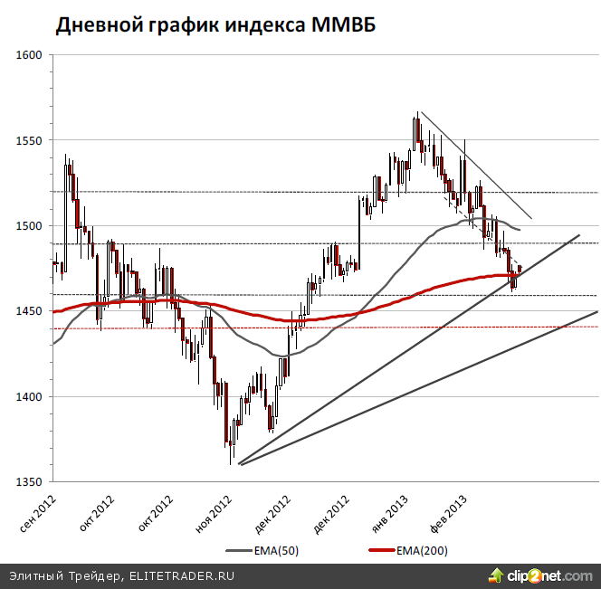 В Азии фондовые индексы сегодня умеренно отскакивают вверх после вчерашнего падения, в лидерах китайский Shanghai Composite (+0,9%) и австралийский All Ordinaries (+1,2%), остальные прибавляют в пределах полупроцента. Пара евро/доллар пока удерживает важную отметку 1,3, а цены на нефть Brent вечером удержались выше 110 долл./барр. Исходя их этого, и с учетом локальной перепроданности российского рынка ожидаем сегодня отскока и у нас, однако важным условием для позитивной динамики внутри дня будет возвращение индекса ММВБ выше отметки 1470 пунктов (там проходят 200-дневная EMA и трендовая линия через минимумы ноября 2012).