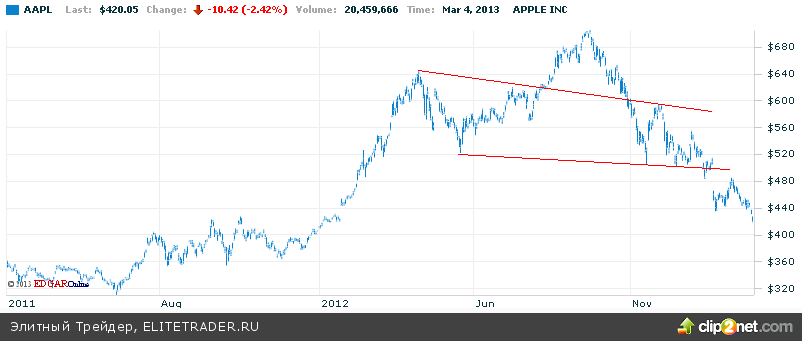 Среди отдельных историй выделим продолжающееся падение в акциях IT-гиганта Apple (-2,42), который вновь уступил звание самой дорогой компании мира нефтедобытчику Exxon Mobil. С технической точки зрения, после закрытия гэпа, образовавшегося после публикации квартального отчета, котировки вновь устремились к минимумам 2012 года, которые вчера были благополучно обновлены. Как показывает дневной графике, в бумаге проходит реализация потенциала фигуры «голова-плечи», который еще не исчерпан.
