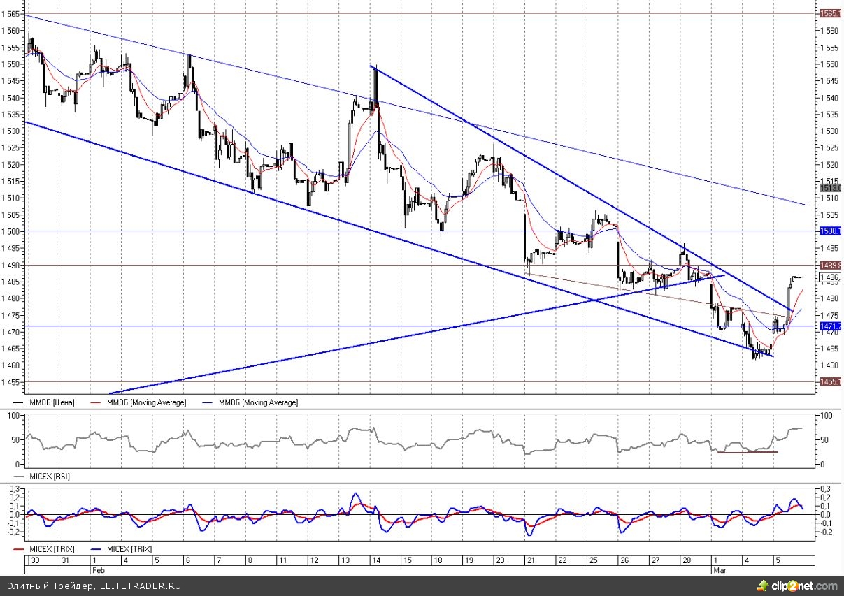 На подъеме индекс добрался до уровней на 1485, закрыв тем самым гэп, оставленный в первый день марта. Сегодня по инерции подъем может быть продолжен, в течение дня пройдет небольшой откат назад. Потенциал для дальнейшего роста - ближайшие сопротивления на 1495 и незакрытый гэп в районе 1500 пунктов. Внизу ориентироваться надо на возможный возврат к пробитому down-тренду на 1475.