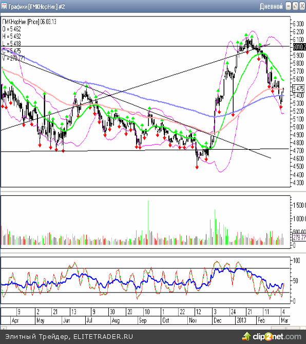 Напомню, что на текущий момент в этих бумагах у нас открыт «лонг» со средней ценой позиции в районе 5380 рублей. Эти позиции я советую удерживать и далее, и рассчитывать на выход котировок как минимум в район 5550-5600 рублей, на который сейчас указывает быстрая скользящая средняя ЕМА21 на днях. При достижении данного района сегодня, позиции предпочтительно закрыть