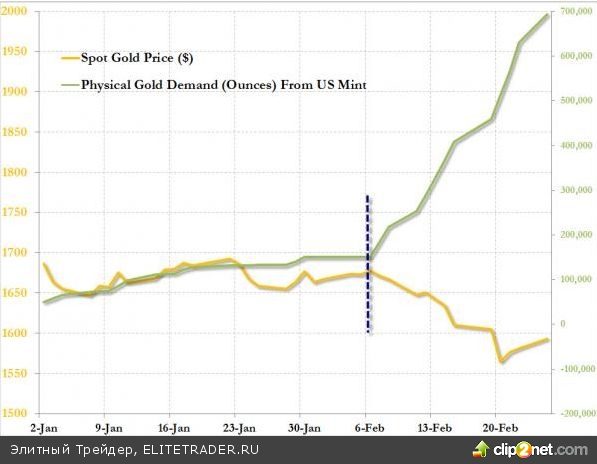 Снижение котировок золота в феврале текущего года вызвало резкий скачок спроса на физический актив. Привлекательные цены сделали свое дело: продукция американского монетного двора пользуется бешеной популярностью. Покупатели понимают ограниченность золота в природе и спешат воспользоваться благоприятными ценами.