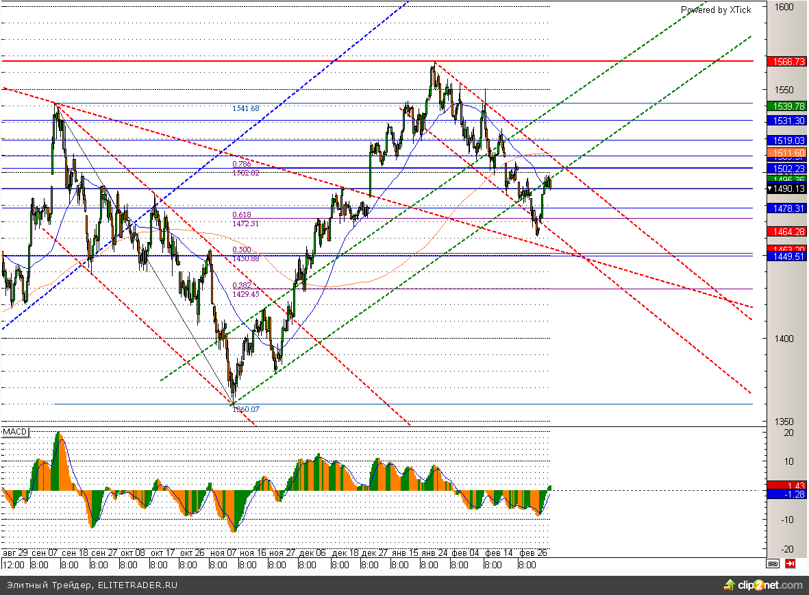 Технически ММВБ находится на очень важном уровне сопротивления 1490, уйдя выше которого, индекс упрется в 1500. Поэтому совершать покупки в текущий момент немного опасно и лучше дождаться либо пробоя отметки 1500, либо похода в район 1480.