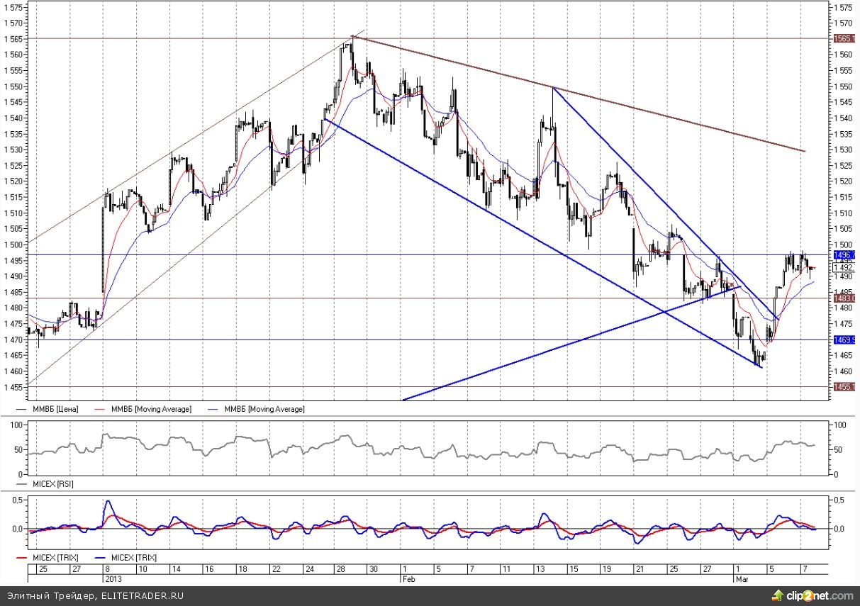 Индекс ММВБ после пробития нисходящего тренда в районе 1475 пунктов и выхода из нисходящего клина на прошлой неделе организовал заметный коррекционный отскок. На этой волне роста был закрыт гэп с первого марта, и индикатор поднялся до уровней сопротивления с конца февраля в район 1497.