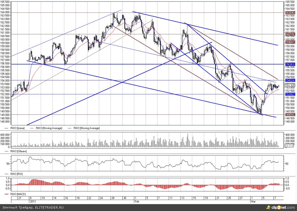 После хорошего и уверенного отскока с мартовских минимумов на 149000 фьючерс на индекс РТС последние пару дней немного консолидируется на достигнутых уровнях в диапазоне 152500-153500. Сегодня будут предприниматься попытки продолжить восходящее движение к ближайшему сопротивлению на 154000.