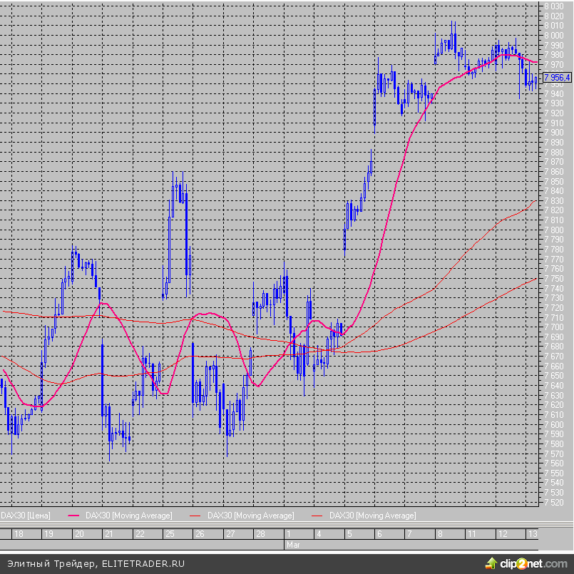 Похожая ситуация наблюдается и в немецком индексе DAX, который с открытия держится в широком диапазоне, при этом нижней границей является отметка 7942 пункта, а верхней – 7972.