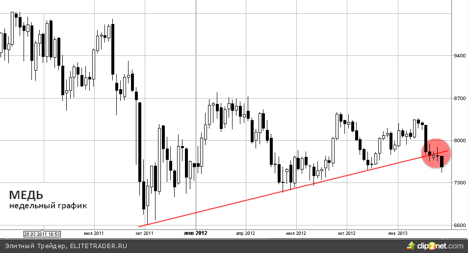 Стоит подчеркнуть, что после нескольких недель "борьбы" (в марте), рынок, по-видимому, преодолел линию тренда, и есть вероятность более глубокого снижения цен на медь.