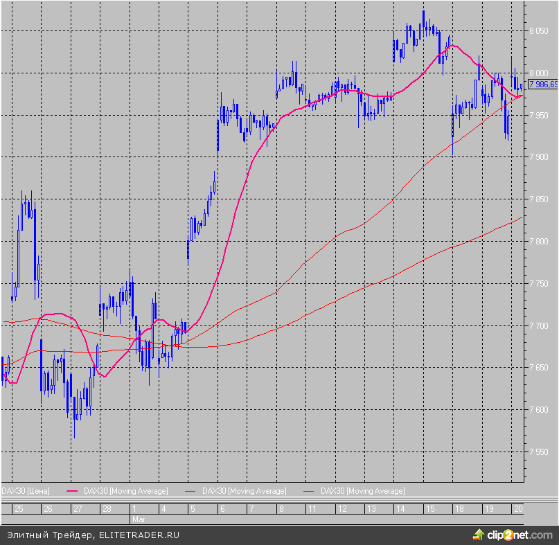 Котировки немецкого индекса DAX подскочили с 7950 до 7990 пунктов на открытии, а затем пробили отметку 8000, однако удержаться на ней они не смогли. В случае негативных новостей по Кипру утренний «гэп» может быть закрыт, и тогда DAX может откатиться ниже 7950 пунктов.