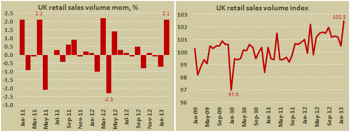Фунт прибавил примерно 50 пунктов (до 1.52 в GBP/USD) после более сильных, чем ожидалось, данных по розничным продажам за февраль. Рост на 1.9% по сравнению с прошлым месяцем оказался значительно выше ожиданий (на 0.6%) после (пересмотренного) спада на 0.4% в январе. По-прежнему средние данные за два месяца демонстрируют довольно оживленное начало года и уводят нас в сторону от ожиданий тройной рецессии для британской экономики (хотя ситуация по-прежнему опасная). Коррекция по кабелю с минимумов сейчас составляет около четырех фигур, что без сомнений потрясло решимость медведей по фунту. Это тренд на форекс, и есть все основания считать, что кабель будет корректироваться ростом и далее. Основные релизы и события по фунту закончены на этой неделе ( разве что публикация обзора CBI в 15:00 МСК).