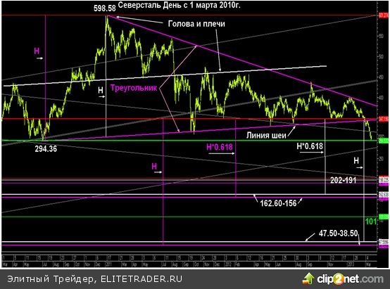 1 июля 2010 года цена акций Северстали показала минимум на уровне 294,36 рубля, к которому вплотную и подобралась позавчера. На этом графике с 1 марта 2010 года я вообразил огромные – треугольник(пурпурный) и ГиП с белой условной линией плеч. Все возможные и невозможные цели обозначены на графике по отложенным вниз – Н и Н*0.618(0.50) Есть ли эти фигуры, поможет ли котировкам собака Баскервилей, чтобы они не сползли в эту пропасть, покажет время. Те же ГиП рисуют и для того, чтобы они не срабатывали. Не без этого!