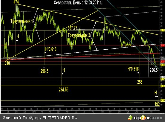 Теперь же - расширим взгляд на их график, например, с 12 сентября 2011года, на котором мной выделен жёлтым цветом треугольник под цифрой 1 высотой от 310 до 474 рублей, из которого цена вышла первоначально вниз на уровне, также обозначенном на графике, равном 398 примерно рублям, который(уровень выхода из той или иной фигуры), как я не раз отмечал прежде, является определёнными поддержкой и сопротивлением в одном лице. Цель по его реализации(высота Н, отложенная вниз из точки выхода) может быть на уровне 234,55 рубля, что не является фактом, ибо истории не раз известны случаи не исполнения целей, даже промежуточных… Так вот, промежуточная цель по нему(Н*0.618), - с Фибоначчи надо бы дружить семьями!, - находится также, как и оговоренная выше в упомянутых ссылками постах, на уровне примерно 296 рублей. Явное пересечение, уточнение и переуточнение целей динамики цены. Если же - вообразить, что первый треугольник с жёлтыми сторонами плавно, со временем, перетёк в более вытянутый под номером два - с белой нижней стороной, из которого цена вышла вниз примерно в районе 346-347 рублей, то отложив ту же самую высоту из точки выхода из него, можно получить цель в районе 192 рублей с промежуточной около 255 рублей. По этому графику всё, если не считать того, что – очевидно – уровни, показанные днями в районе 296 рублей, условно оговаривались на графике ещё год назад почти, ибо цена вышла вниз из первого треугольника в начале второй декады апреля прошлого года…