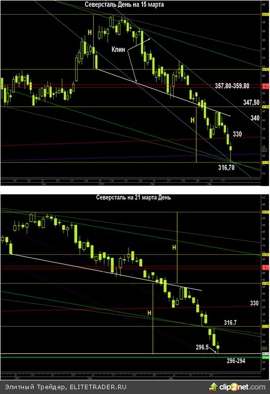 Переходим к следующему, более укрупнённому, тому же графику с 16 мая 2012 года. На нём я бы выделил из своего воображения фигуру Голова-плечи с максимумом условной головы, обозначенным на графике и равном 437,7 рубля. Линии условных плеч и шеи показаны белым цветом. Последняя была пробита и кратенько протестирована в районе 354,5 рубля. Цель реализации ГиП(её высота Н, отложенная вниз из точки пробоя условной линии шеи) находится в районе 260 рублей… Промежуточная - на уровне 296(296,5) рубля(опять – двадцать пять), которая была достигнута в среду 20 марта. Комментарии – излишни… Можно, правда, отметить, что уж больно много сошлось в этой точке, но надо помнить, что сопротивления в районе от 310 до 317 рублей, тем более 330 могут стать препятствием для роста, хотя слетать на 360 рублей очень заманчиво для покупки….