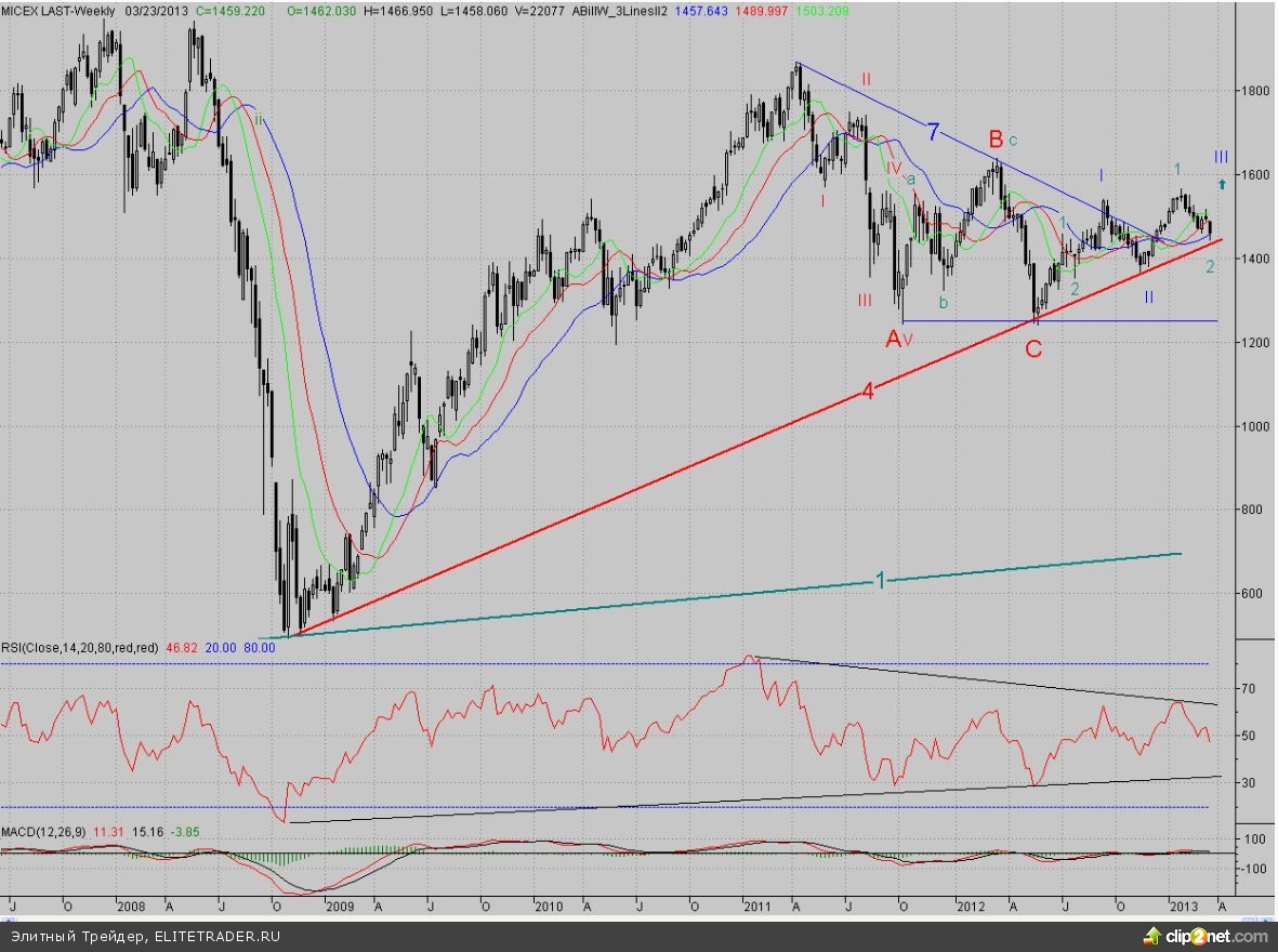 Тем не менее, технически сейчас картина стала привлекательной для покупателей, ведь совсем рядом находится мощная поддержка в лице долгосрочного растущего тренда (4), берущего своё начало ещё с осени 2008 года (см. недельный график) – и полагаем, что она станет хорошим подспорьем для «быков». Так что инвесторам надо попристальнее присмотреться к нашему рынку.