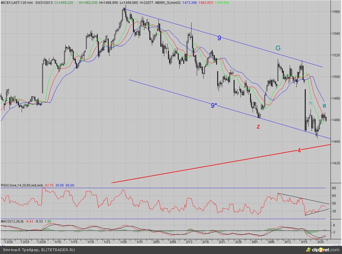Таким образом, отскок «быкам» в очередной раз не удался, и даже казалось бы неплохой разгон, взятый в среду, закончился пока ничем. Сегодня же на умеренно-негативном внешнем фоне покупателям и вовсе придётся защищать ту небольшую область, которую им удалось отвоевать у «медведей» после избиения в понедельник. С одной стороны, для «быков» не всё потеряно и не исключено, что отскок продолжится, приняв форму трёхволновки «a-b-c». Но чтобы этот сценарий реализовался, покупателям надо удержать уровень 62%-ной коррекции от роста последних двух дней (1452 п.). Роль ближайшего сопротивления при этом сыграет вчерашний максимум «a» (1467 п.), чуть выше – уже упомянутый фрактал h (1469,8 п.).
