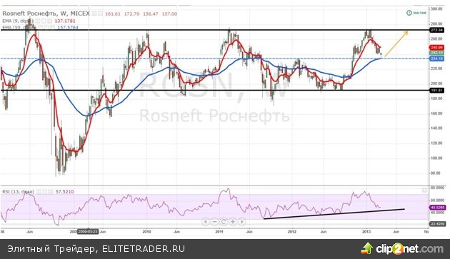 Покупка «танкистов» должна положительно сказаться на котировках Роснефти. Технически, цена находитяс на серъезном уровне поддержки в 234 руб. Подтверждение можно увидеть как по EMA (50), так и по RSI (13), который находится на отметке 50%, что в пользу роста. Большая вероятности что цена дальше будет двигаться вверх. Ближайшая цель - 272 руб. за акцию.
