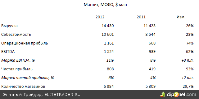 Компания отчиталась по МСФО за 2012 Ритейлер Магнит опубликовал финансовые итоги прошедшего года по МСФО. Выручка компании выросла на 26% с $11,4 млрд до $14,4 млрд. Рост EBITDA составил 62% с $939 млн до $1,5 млрд. Маржа EBITDA подросла на 3 п.п. до 11%. По итогам успешного года компания нарастила прибыль почти вдвое с $419 млн до $808 млн. Маржа чистой прибыли составила 6%, увеличившись на 2 п.п. г/г.