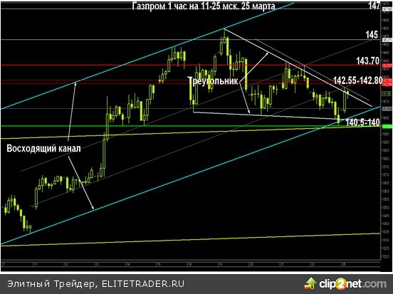 Продолжая следить за акциями Газпрома, на 11-25 мск. сегодня можно отметить, что на их часовом графике цена отскочила от пересечения нижней и верхней сторон, соответственно, голубого и жёлтого восходящих каналов, возможно ложно проколов нижнюю сторону белого треугольника, в пятницу, а сегодня пытается выйти из него вверх с предполагаемыми целями реализации на белых горизонтальных уровнях, обозначенных на графике. Другие возможные уровни поддержек и сопротивлений показаны также на графике
