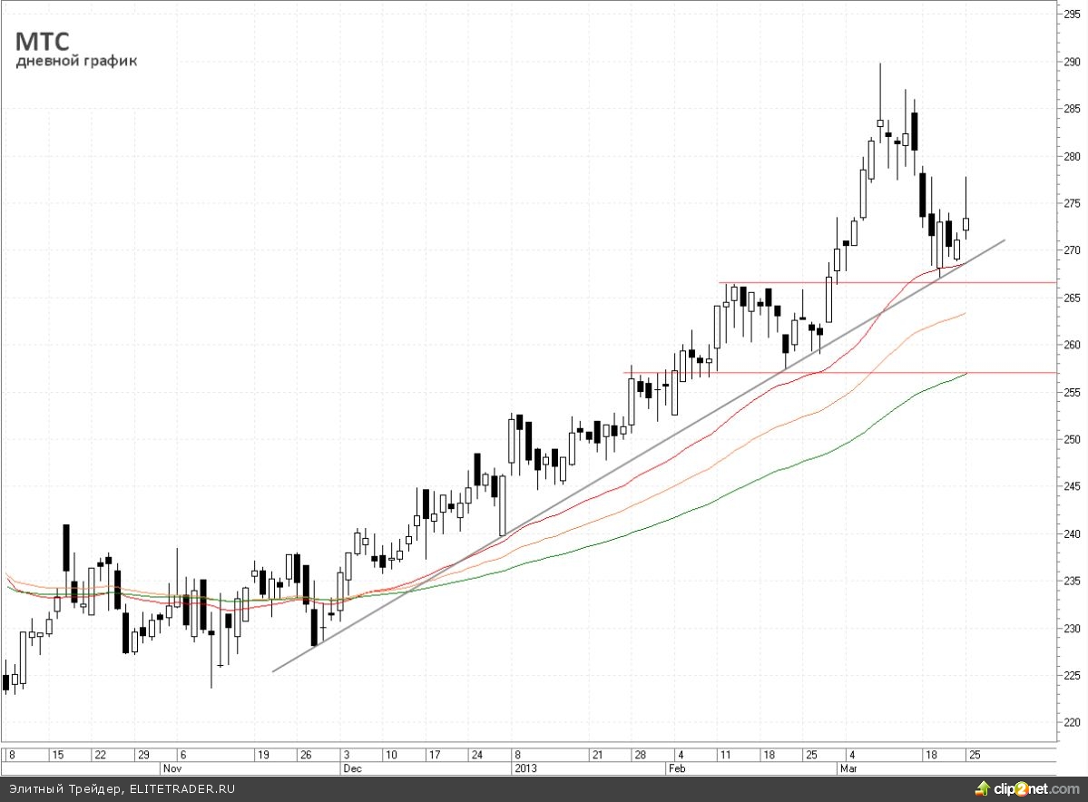 Одна из бумаг, которая радует инвесторов и спекулянтов вот уже на протяжении полутора лет – акции (обыкновенные) МТС. За это время на графике просматривается довольно уверенный up-тренд, который, тем не менее, предоставляет точки, как для покупок, так и для краткосрочных продаж.